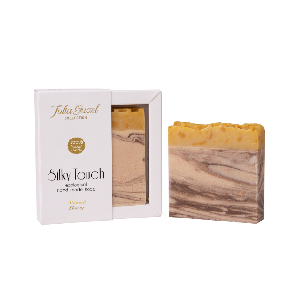 - صابون اللوز والعسل سيلكي تتش من جوليا غوزيل مصنوع يدوياً، مما يعزز الاهتمام بالتفاصيل ويضفي طابعًا فريدًا على كل قطعة.